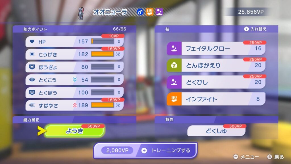 今回アルセウスから連れてきたオオニューラは攻撃と素早さに極振り。残り2ポイントは体力に振りました。